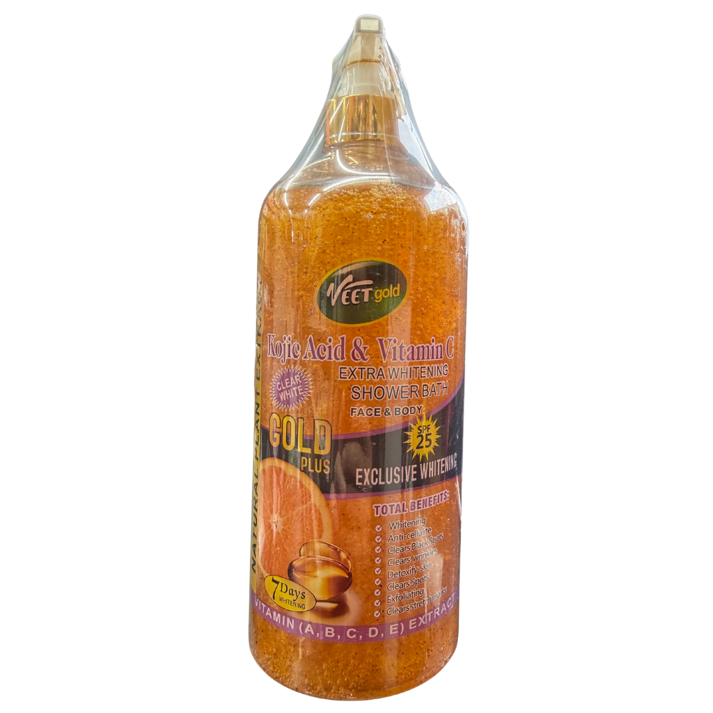 Veet Gold Kojic Acid & Vitamin C Extra Whitening Shower Bath is a powerful face and body cleansing formula designed to help brighten, cleanse, and rejuvenate the skin. This exfoliating shower bath combines Kojic Acid and Vitamin C with plant-based extracts to help improve skin tone, reduce the appearance of dark spots, and leave skin feeling smooth and refreshed.